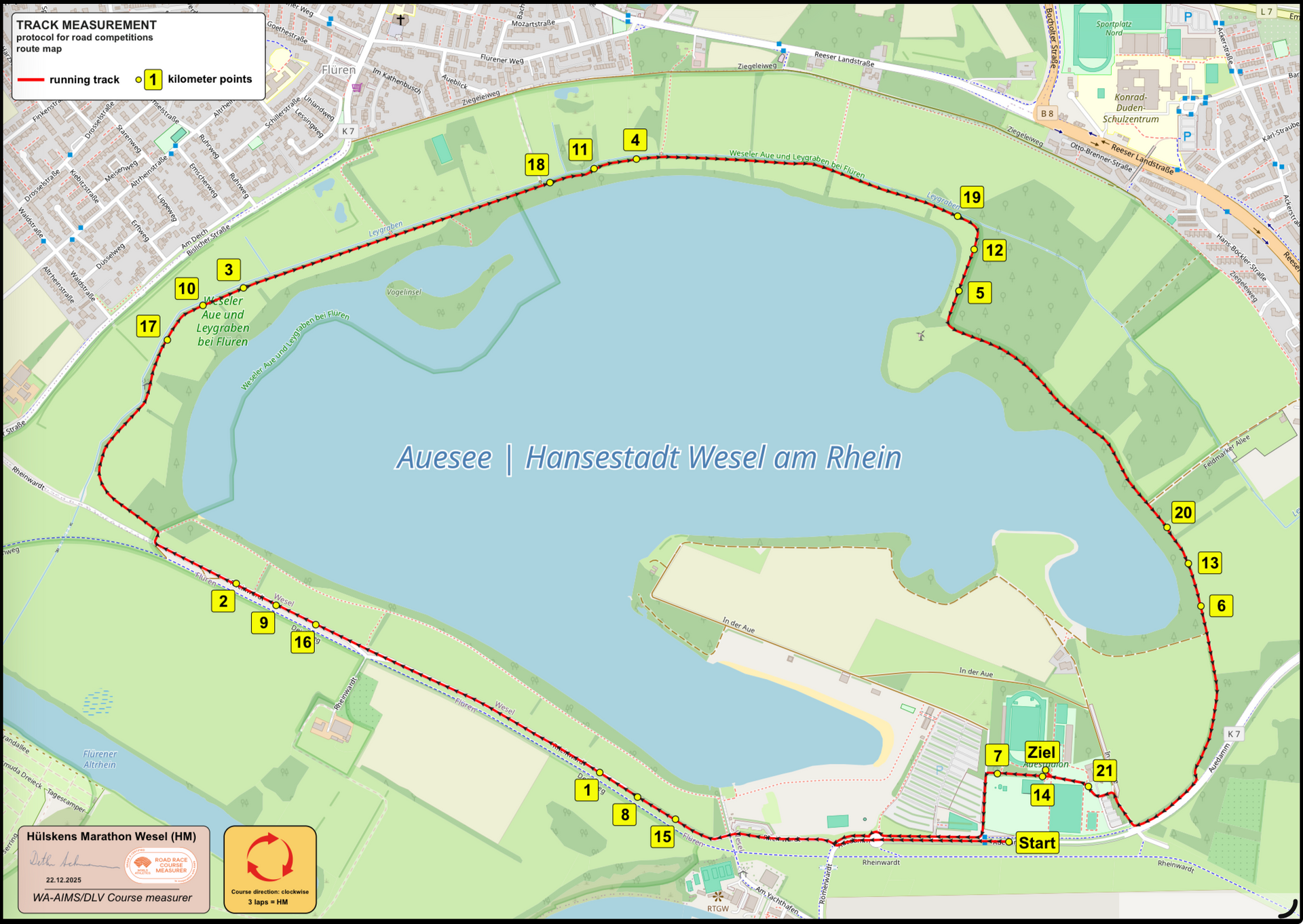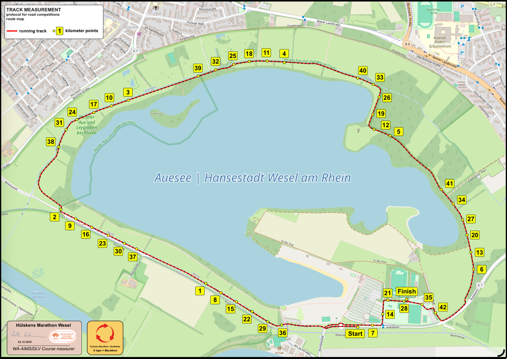 Der Auesee ist ist kein natürlicher See. Erst durch die Rohstoffgewinnung von Kies und Sand durch das Weseler Unternehmen Hülskens entstand ab den 1960er Jahren mitten in der Kreisstadt etwas Neues. Seit Anfang der 1990er Jahre ist der Auesee Lebensraum für Tiere und Pflanzen, bietet Erholungsmöglichkeiten für Anwohner, Besucher und Touristen. Neben vielen sportlichen Möglichkeiten wie Segeln, Tauchen, Angeln und das Naturfreibad laden Events wie das Freiluft-Sommerkino und der Hülskens-Marathon nach Wesel ein. Der Rundweg um den See ist die Laufstrecke mit einer Rundenlänge von gut 7,1 Kilometern. Die Strecken werden amtlich vermessen, weshalb die erste gelaufene Runde etwas kürzer ist. Der Untergrund ist auf ca. 3,5 km Asphalt, die restlichen ca. 3,6 km sind befestigter Schotter. Start und Ziel befindet sich im bzw. am Westenergie-Auestadion Wesel, In der Aue 1, 46487 Wesel.